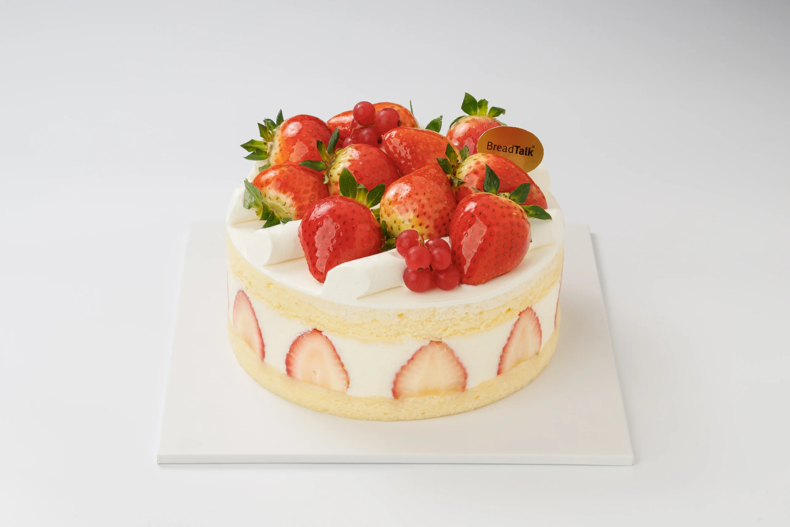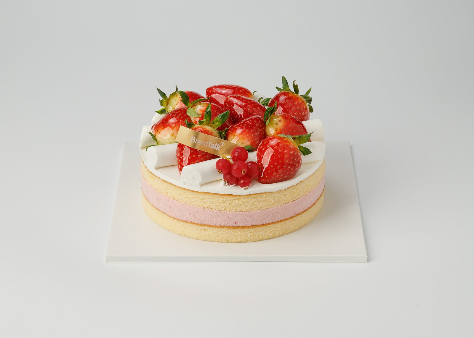 A light, berry-filled delight for strawberry lovers! Layers of creamy yogurt mousse and sliced strawberries sit atop soft vanilla chiffon base. Topped with glossy, red strawberries for a charming finish